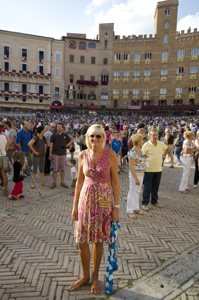 Jean with Onda Flag Published August 18, 2011 at 676 × 1020 in The day we didn’t get thrown out of the Palio Jean in the Campo as it fills up sporting her Onda (Dolphin) contrada scarf