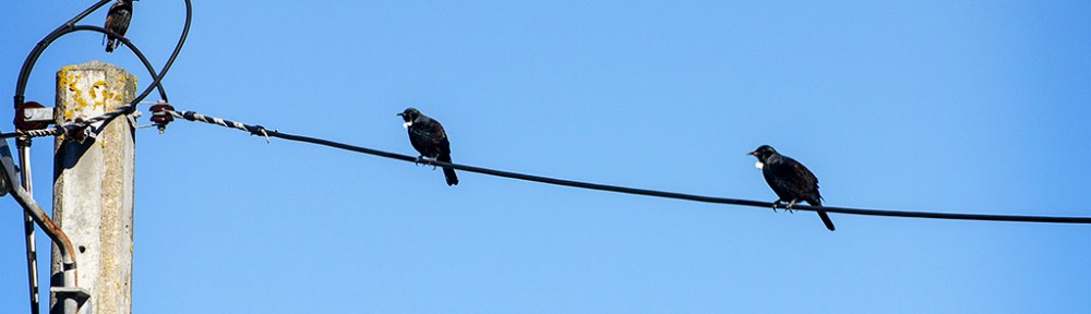 It has become a common sight and sound in the garden – Tui flying and singing throughout the summer and into the autumn. For the first time I can remember yesterday two Tui (or Tuis) sat together on the telephone wire across the road.