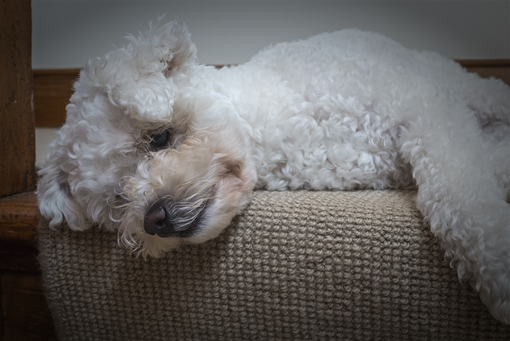 Bella lies on stairs
