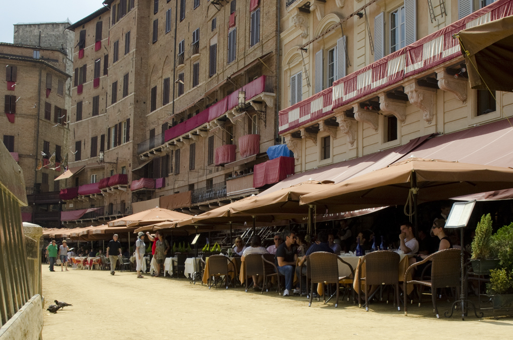The view wasn’t quite as good but the crowd was friendly and the dogs were settling. Within minutes, two things happened. Firstly we felt the first few raindrops that can signal a Tuscan downpour and secondly some polite officials told us that dogs were not allowed at the Palio as they might scare the horses so we had to leave.