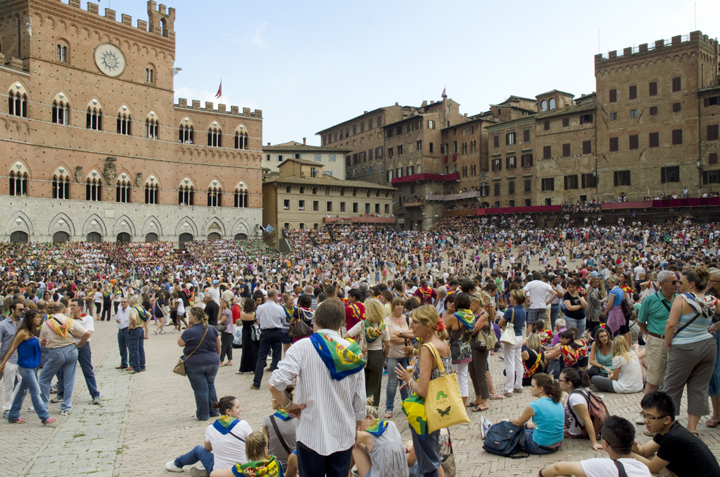 We knew the rehearsal was due to start at 7pm so we moved into the stands directly behind the bar and made ourselves comfortable. By this time, there were quite large crowds in the Campo, with groups supporting their contrada with songs, chants and general noisiness. It soon became apparent that the stands were all reserved, in fact quite large sums of money are spent to ensure a good spot.