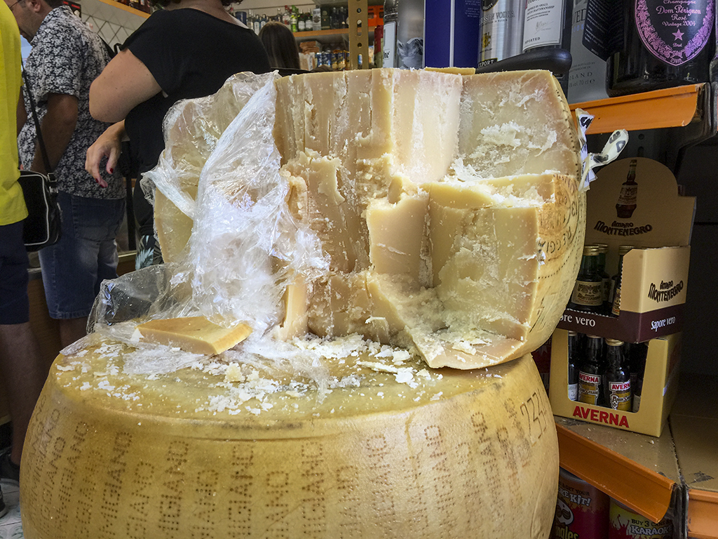 In New Zealand buying Parmigiano Reggiano usually means buying small pre-packed slices, at great expense from the super market or deli. In Italy it’s different – as can be seen from the Parmigiano available at our favourite alimnetari. You give an indication of how much you want and it’s sliced off the round – right there in the middle of the store.