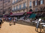 When we arrived on Wednesday the track was down and all the bars and restaurants that ring the Campo had their tables and chairs set up on the track. Because of the temporary grandstands, they also have to squeeze their tables into a smaller area to allow people to walk past.